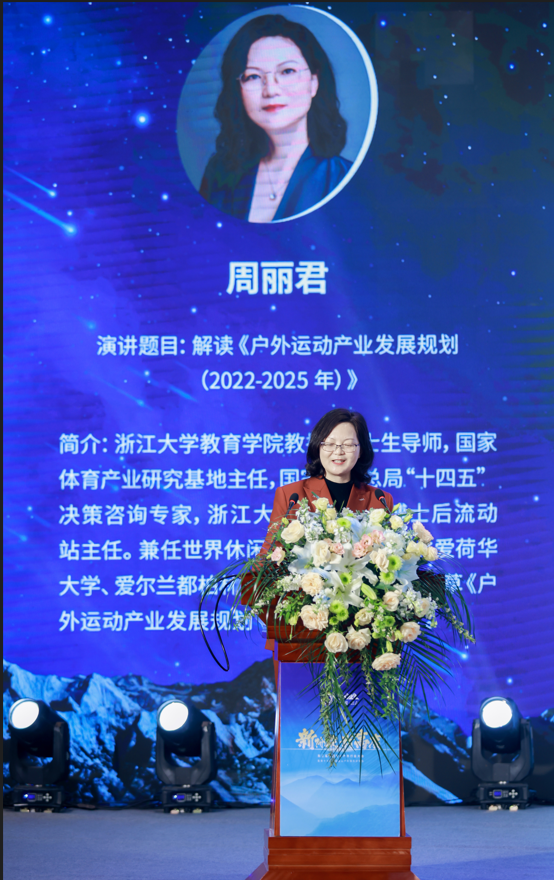在此次大会上,周丽君教授作为我国首部户外运动产业规划——《户外运动产业发展规划(2022-2025年)》(下称“《规划)》”)的主持起草人,作题为“解读《户外运动产业发展规划(2022-2025年)》”的主旨报告,通过规划背景、规划内容和规划亮点三部分对《规划》进行了深入解读。