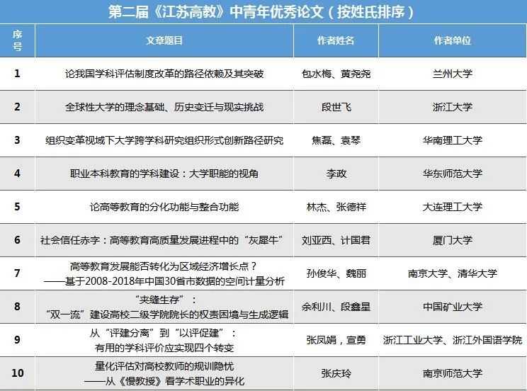 为活跃高等教育学术研究氛围,鼓励和培育中青年作者队伍,促进高等教育学术交流与创新,《江苏高教》编辑部于近期开展了“第二届中青年优秀论文评选活动”。评选分编辑部初选、读者网络投票、专家评审三个环节。读者网络投票、专家评审评分所占比重分别为30%、70%,最终评选出第二届《江苏高教》中青年优秀论文10篇,我院特聘副研究员段世飞博士的论文《全球性大学的理念基础、历史变迁与现实挑战》位列其中。