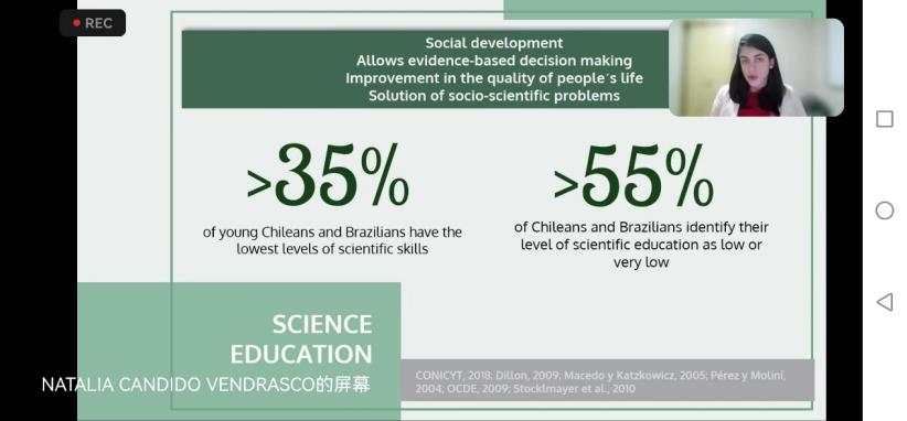 7月4日上午,来自智利天主教大学的Natália Cândido Vendrasco博士带来了第二场讲座,题为“非正式科学教育情景下的调节:调解员的专业知识与不同的调解模式”。她以自己的一项研究为主体,给同学们带来了直观且深刻的科研体验,进一步帮助大家认识到调解员的知识储备以及不同调解模式在非正式教育中的重要性。