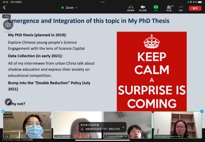 最后,英国伦敦国王学院的Cao Ye博士以“政策与教育不平等的联系”为主题,界定并解释了“影子教育”“内卷化”和“双减政策”等重要概念的定义,提出四个关于影子教育的关键性研究问题,探讨了影子教育和教育内卷化对中国家长焦虑和中学生科学参与的现状和影响等问题。