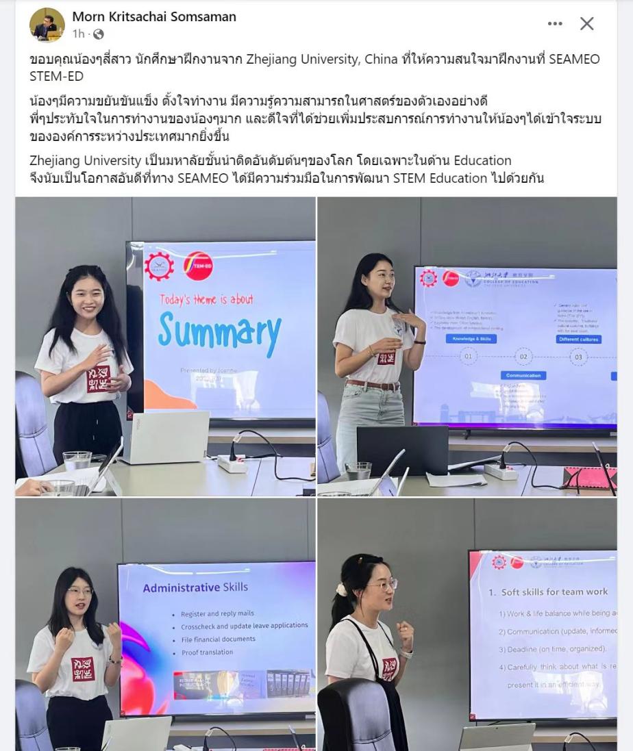 “谢谢四位来自中国浙江大学的姑娘有兴趣在 SEAMEO STEM-ED 实习,她们勤奋好学,工作积极主动,在本专业领域具有良好的知识和能力,同事们对他们的工作印象深刻。我很高兴能够帮助学生增加工作经验,更多地了解国际组织的体系。浙江大学是世界顶尖大学之一,尤其是在教育方面,因此,和SEAMEO合作共同发展STEM教育是一个很好的机会。”