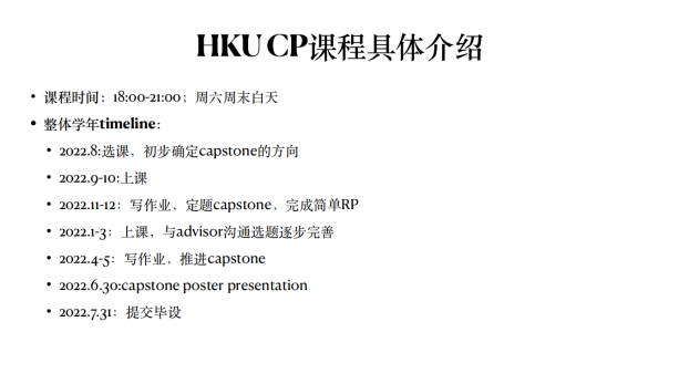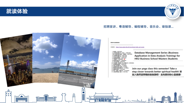 紧接着,周佳雯学姐从确定留学目的地、学校和专业、如何进行语言准备等方面向同学们介绍了硕士申请的流程及注意事项。周学姐特别提醒同学们,在推荐信的准备环节要多和任课老师沟通,不要害怕被老师拒绝。在周学姐对港大课程内容设置和个人就读体验的分享中,同学们也了解到港大对课程作业要求较高,需要具备良好的英语听说读写的能力;而留学深造,也有助于提高同学们自身的跨文化沟通能力和适应能力。