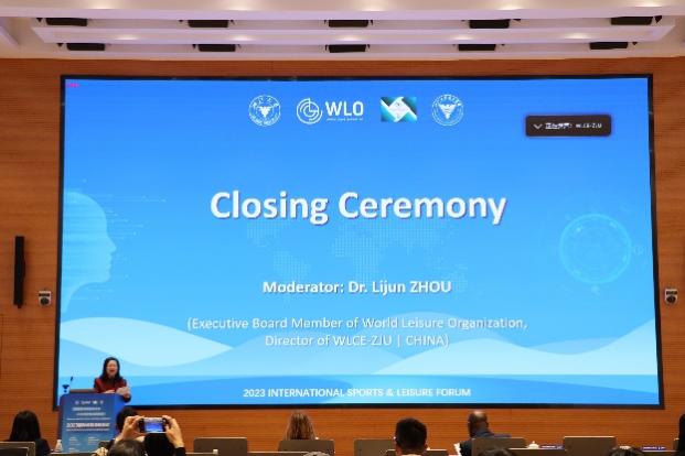 在结束精彩的主旨演讲后,此次大会主席、世界休闲组织浙江大学休闲卓越中心主任周丽君教授主持此次会议闭幕式。在闭幕式环节,世界休闲组织首席运营官克里斯蒂娜·奥特加(Cristina Ortega)教授向与会者系统介绍了世界休闲组织重点开展项目,并表示热烈欢迎广大学者、从业者共同参与全球休闲事业的建设。随后,浙江大学教育学院副院长胡亮教授对本次会议进行了总结并致闭幕辞。最后,大会主席周丽君教授向为本次会议带来精彩报告的各位演讲嘉宾、关注并支持此次会议的领导、学者及学子表示诚挚谢意,并与全体与会者相约下一年国际体育休闲会议再聚。