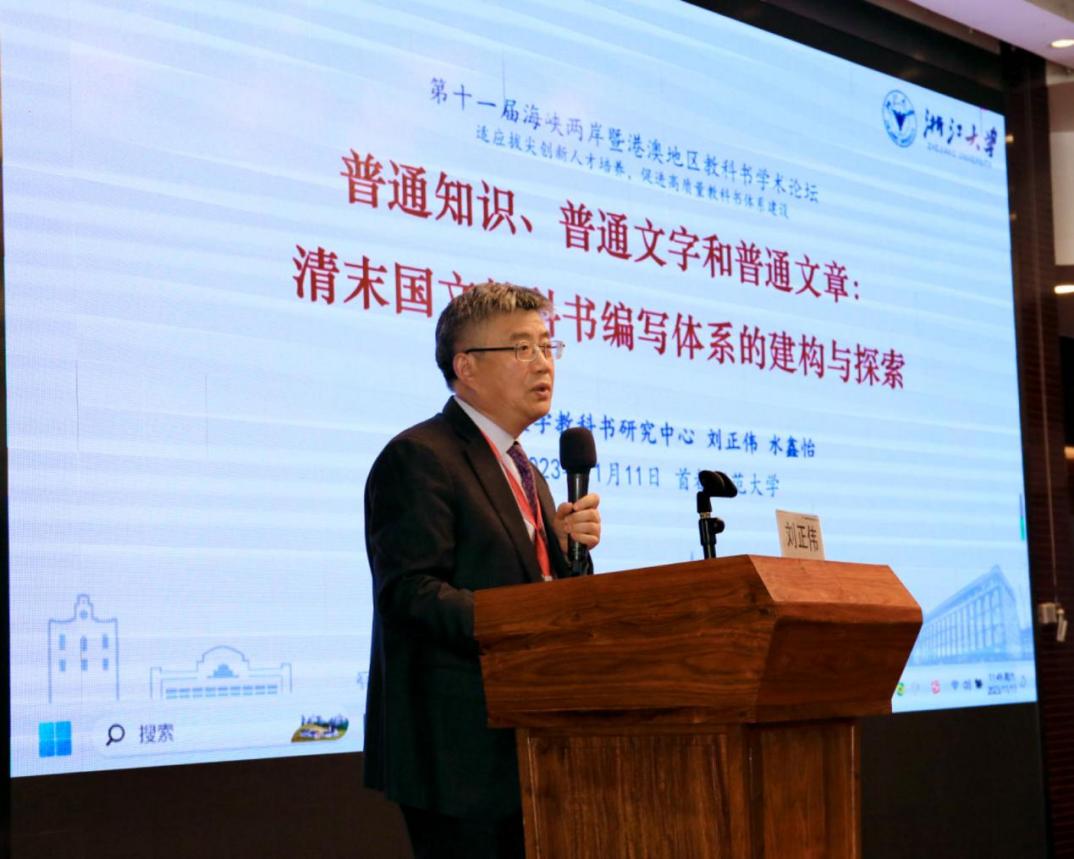 2023年11月11日至12日,由首都师范大学教育学部、首都师范大学教育学院、首都师范大学教科书博物馆等联合主办的“第十一届海峡两岸暨港澳地区教科书学术论坛”在北京召开,论坛的主题为“适应拔尖创新人才培养,促进高质量教科书体系建设”。来自日本追手门学院大学、新加坡南洋理工大学、中国台湾台北教育大学、中国香港教育大学、中国澳门城市大学、北京师范大学、华东师范大学、浙江大学、中国教育科学研究院等单位的近200名专家学者参与论坛。首都师范大学党委书记缪劲翔、教育部教材局副局长陈云龙分别致辞,首都师范大学田慧生教授、人民教育出版社课程教材研究所余宏亮研究员、北京师范大学胡定荣教授、澳门城市大学郭晓明教授、台北教育大学周淑卿教授、新加坡南洋理工大学国立教育学院胡月宝副教授、浙江大学刘正伟教授、首都师范大学张增田教授等学者作大会主旨报告。