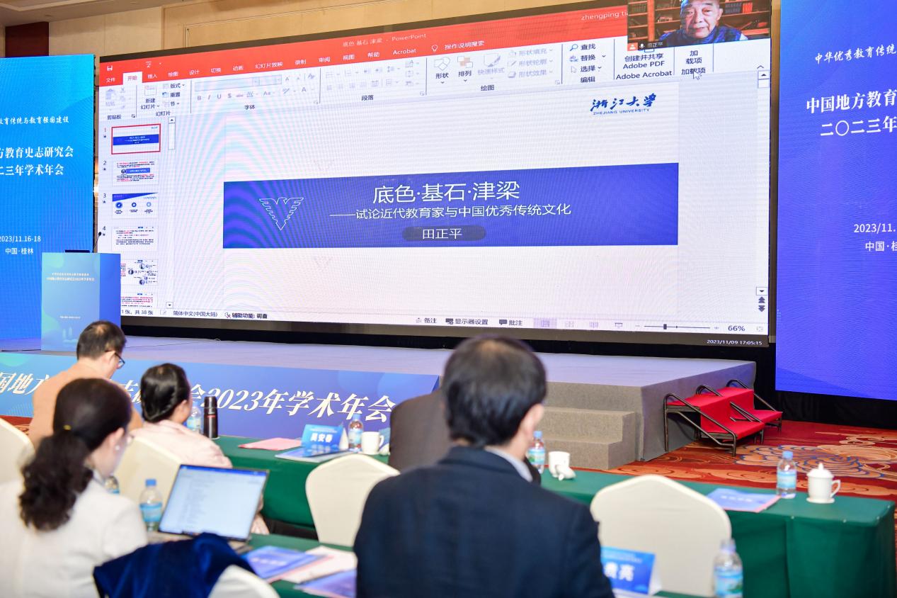 2023年11月17日,由中国教育科学研究院指导,中国地方教育史志研究会和广西师范大学联合主办,广西师范大学教育学部、广西民族教育发展研究中心、中国教育科学研究院教育史研究所承办的“中国地方教育史志研究会2023年学术年会”在广西桂林召开,年会的主题为“中华优秀教育传统与教育强国建设”。广西师范大学校长孙杰远教授、中国教育科学研究院副院长陈如平研究员、中国教育学会副会长李政涛教授、中国地方教育史志研究会会长高宝立研究员分别致辞,中国地方教育史志研究会理事及来自中国教育科学研究院、国家教育行政学院、浙江大学、中国科学院大学、华东师范大学、南京师范大学等科研院所的100余位专家学者参加本次年会。浙江大学文科资深教授田正平教授,浙江大学文科资深教授、浙江大学科举学与考试研究中心主任刘海峰教授分别作大会主旨报告,中国地方教育史志研究会副会长、教育部浙江大学基础教育课程研究中心常务副主任刘正伟教授担任分论坛评议人,浙江大学课程与教学论专业博士毕业生谷亚作分论坛报告,浙江大学在读博士生苏怡璇参加会议。