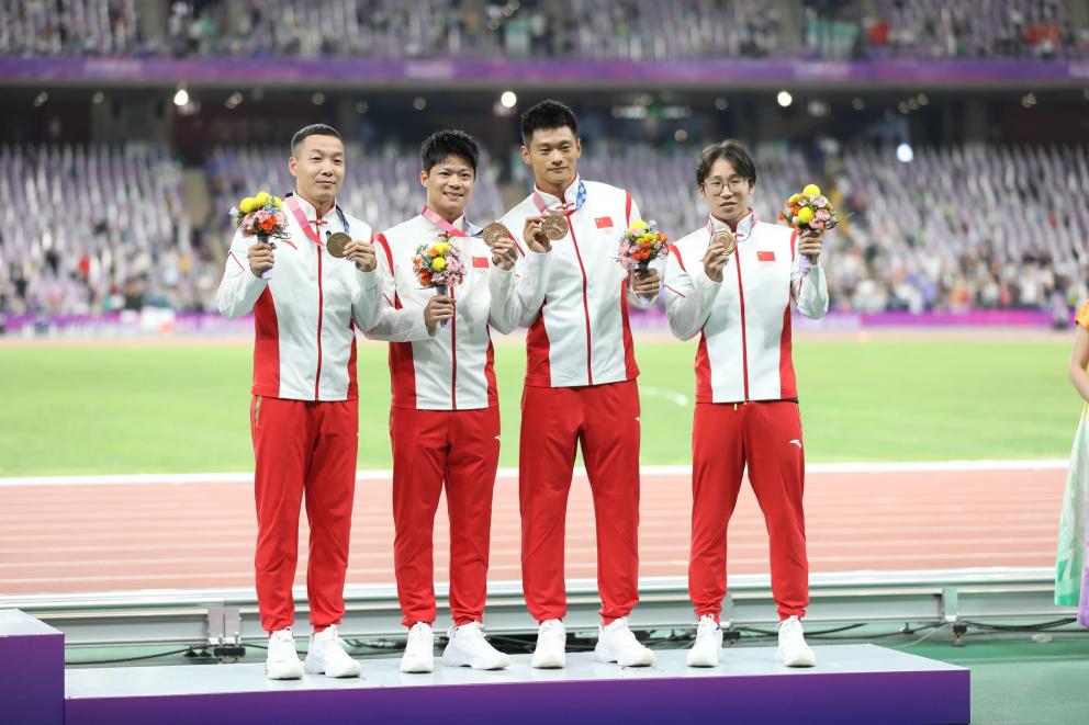 (在亚运田径赛场上递补东京奥运会男子4X100米接力铜牌)