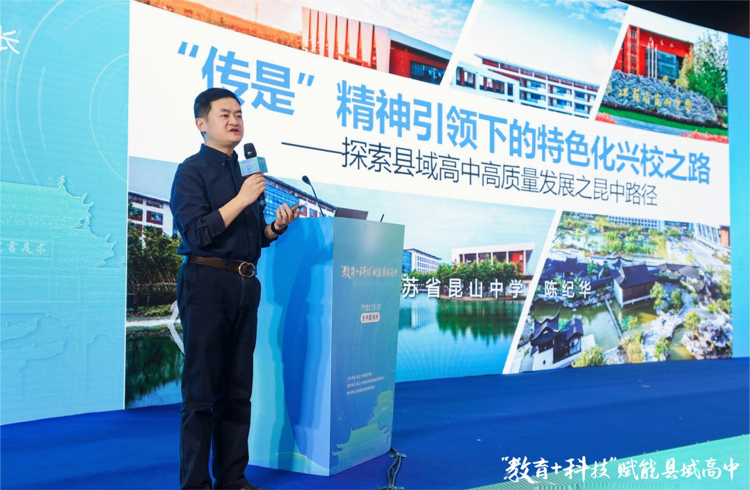 江苏省昆山中学党委书记、校长陈纪华作“‘传是’精神引领下的特色化兴校之路--探索县域高中高质量发展之昆中路径”,从办学目标、育人目标、师资专业发展、构建“传是”课程体系,深度推进中外合作教学、全面优化人才培养模式、充分示范辐射等方面,系统分享了昆中的办学经验。