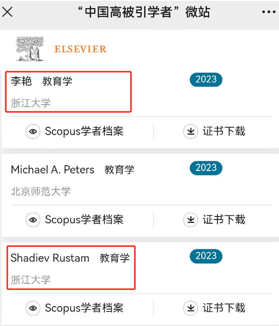 3月27日,爱思唯尔(Elsevier)正式发布了2023“中国高被引学者”(Highly Cited Chinese Researchers)榜单。入选榜单的学者来自496所高校、企业及科研机构,覆盖了教育部10个学科领域、84个的一级学科。其中教育学一级学科共有19位学者入选,我院李艳教授以及首批浙江大学“文科学术骨干教师引育计划”入选者Shadiev Rustam长聘教授上榜。