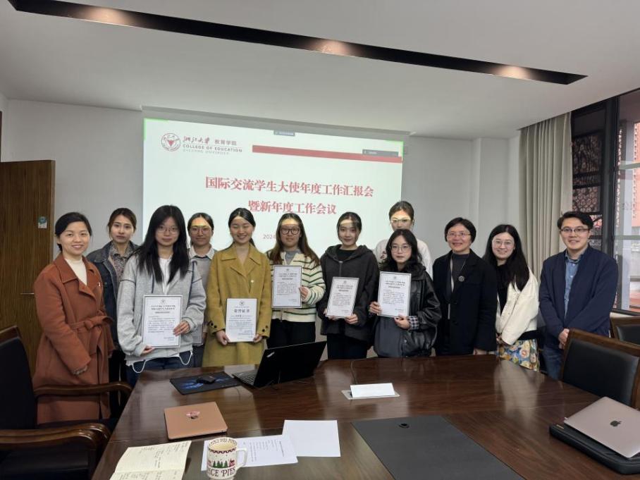 2024年4月8日,第三届国际交流学生大使年度工作汇报会暨2024年度工作会议在教育学院大楼222室召开,2023年度国际交流学生大使、2024年度新任学生大使参加,学院分管国际化工作副院长李艳教授、党委副书记崔倩老师、团委吴春霆老师受邀出席本次会议。会议由学院国际化岗位王伊滢老师主持。