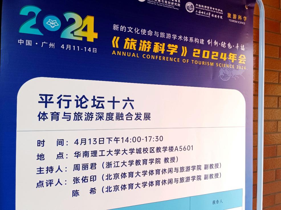 4月11日至14日在华南理工大学举行了《旅游科学》2024年会。浙江大学教育学院周丽君教授受邀担任此次年会平行论坛“体育与旅游深度融合发展”召集人并主持该场学术活动,2021级体育人文社会学专业博士生兰伟参会并进行了主题汇报。