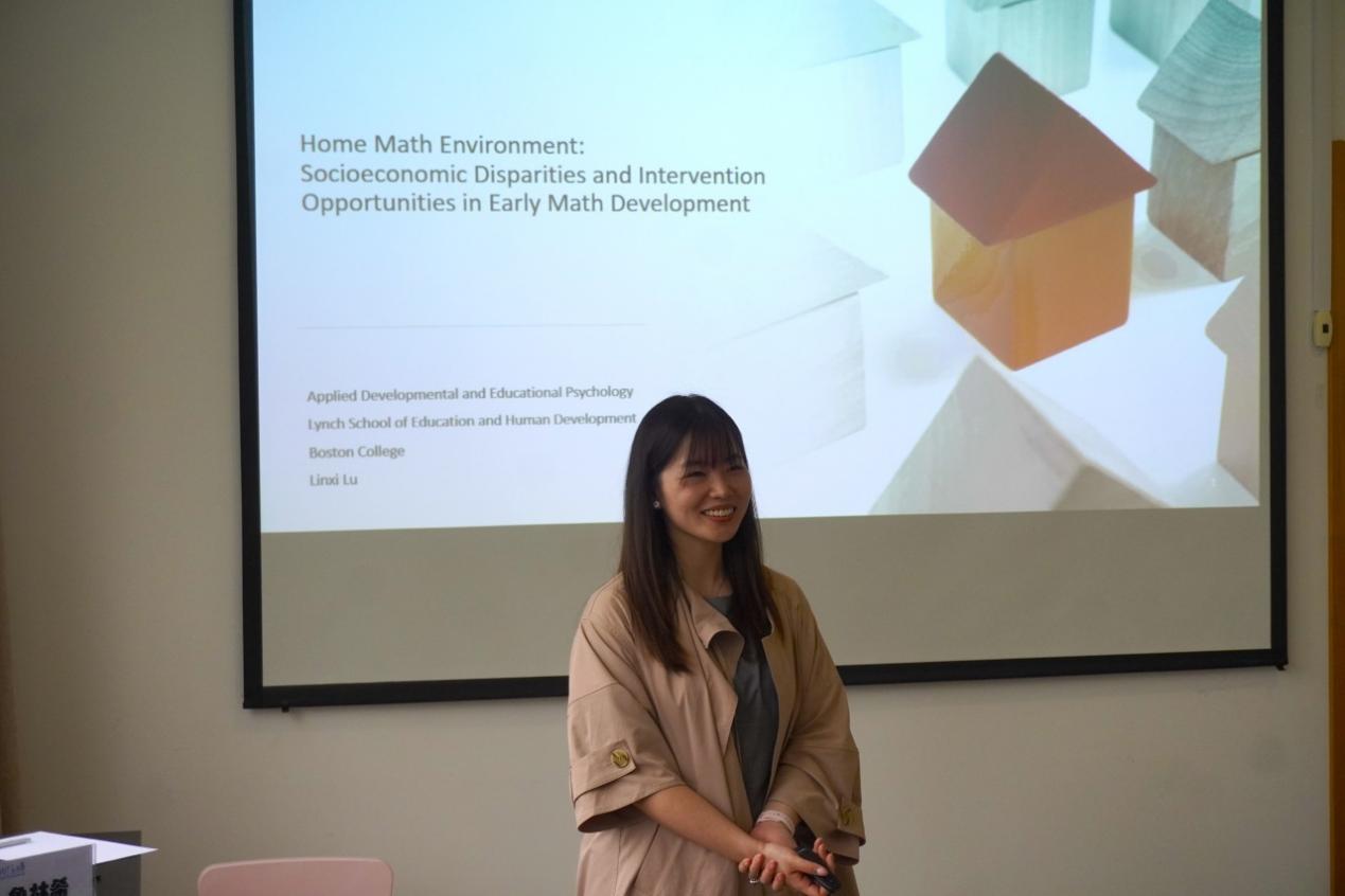 本次活动邀请了波士顿学院应用发展与教育心理学博士鲁林希带来题为《家庭数学环境的理解和优化:早期数学发展中的社会经济差异与干预机会》的专题报告。