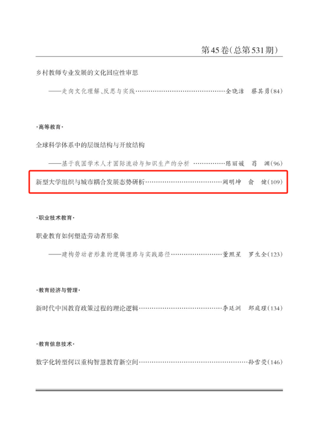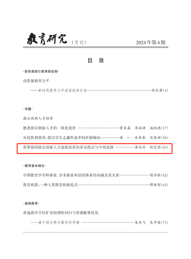 教育学院“百人计划”研究员李木洲、教育学院2022级教育史专业硕士研究生孙艺源的学术论文《世界强国拔尖创新人才选拔培养的多元模式与中国选择》和教育学院兼任研究员阙明坤、广州大学党委学生工作部助理研究员俞健的学术论文《新型大学组织与城市耦合发展态势研析》在2024年第4期《教育研究》上刊发。
