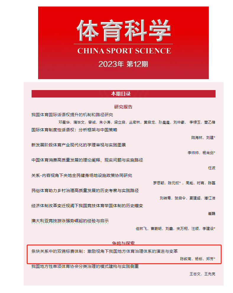 我院体育学系郑芳教授、2021级体育人文社会学专业博士研究生陈叙南同学,宁波大学体育学院杨铄教授的学术论文《条块关系中的双锦标赛体制:激励视角下我国地方体育治理体系的演进与变革》在2023年第12期《体育科学》上刊发。