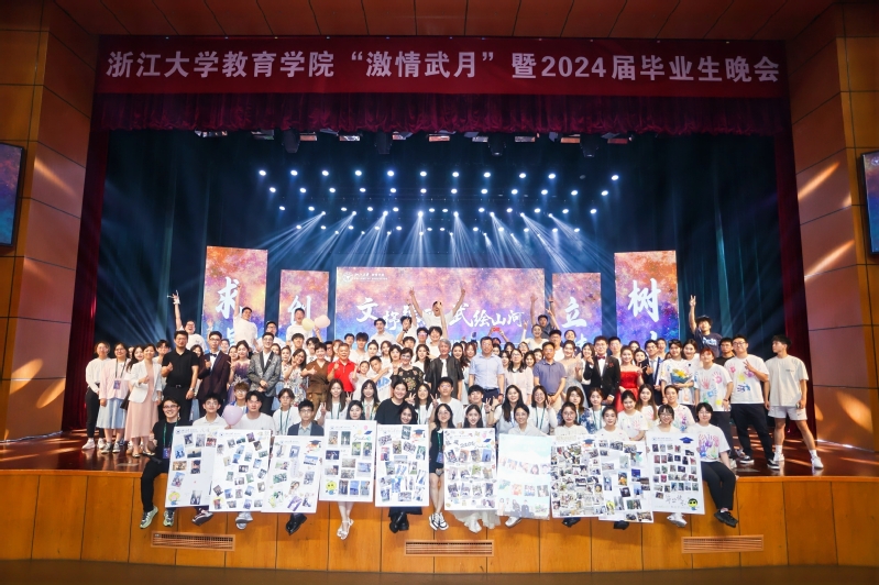 2024年6月14日晚,浙江大学教育学院“激情武月”暨2024届毕业晚会在紫金港校区小剧场顺利举行。浙江大学教育学院院长阚阅老师,教育学院党委书记叶晓萍老师,校友林家俊、陈建萍伉俪,校友韩秋女士,校友孙佳风学长以及教育学院教育硕士实践导师,浙江大学附属实验学校、杭州市公益中学校长潘志平老师等出席晚会,出席晚会的还有教育学院副院长孙元涛老师,教育学院副院长兼体育学系系主任胡亮老师,教育学院党委副书记、纪委书记崔倩老师以及2024届毕业生和其他师生代表。