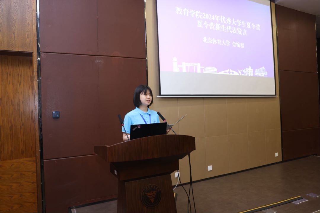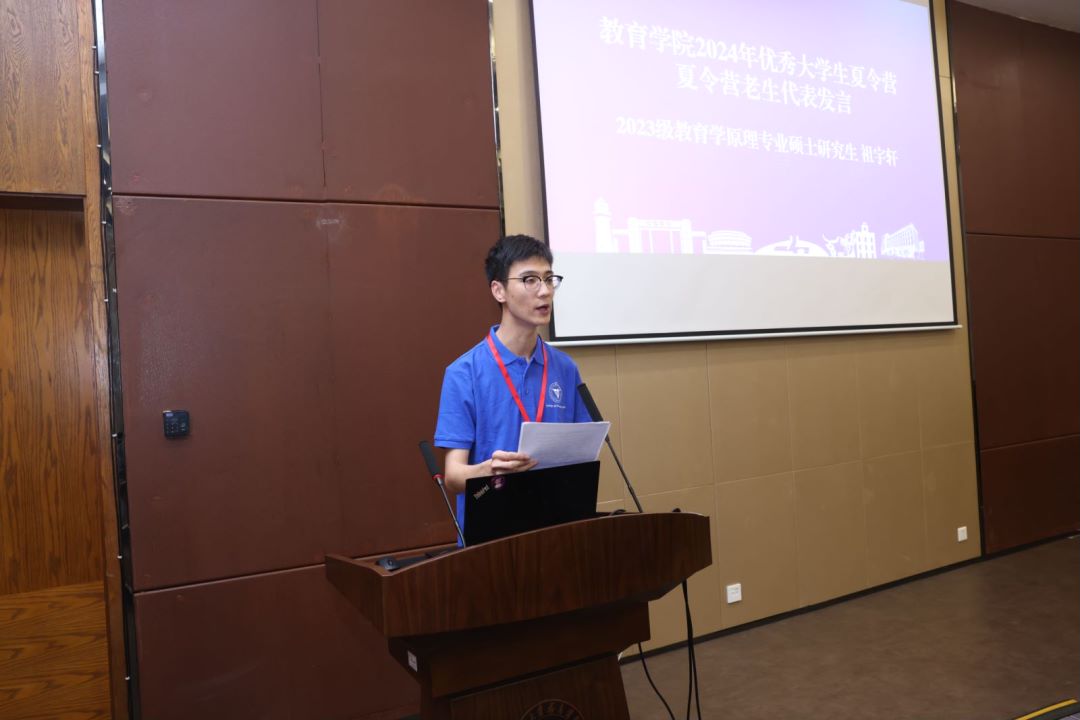 2023级教育学原理专业硕士研究生祖宇轩同学作为夏令营老生代表发言,他分享了自己两年前参与夏令营的经历和目前在浙江大学的学习感悟,并鼓励各位营员怀揣梦想,带着对浙大的期待与对学术的抱负,珍惜和享受此次夏令营。北京体育大学的金愉程同学代表夏令营全体营员发言,表达了自己对浙大教育学院的向往,抒发了自己对教育事业的理想和信念,并期待在夏令营期间与老师们进行学术碰撞与交流,与同学们相互了解、增进友谊。