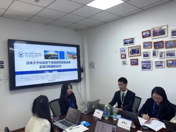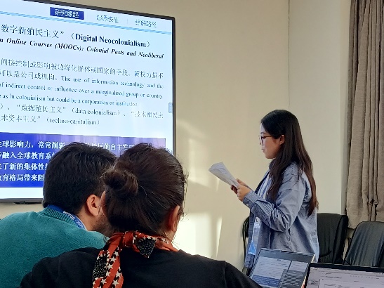 硕士生孙嘉怡、刘林佳作了《日本少子化背景下高等教育发展战略及其对我国的启示》《数字时代高等教育国际化如何去殖民化——数字新殖民主义的视角》的报告。
