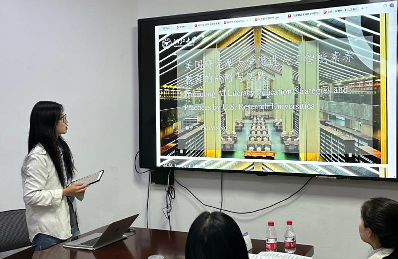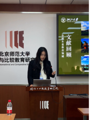 本科生仲淑涵、徐鸿芸、姚伊宁作了《“国优计划”实施的动因、举措与挑战》《联合国教科文组织女童教育政策执行的分析:基于史密斯政策执行模型的视角》《美国研究型大学促进人工智能素养教育的战略与实践》的报告。