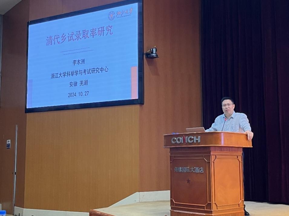 10月27日上午的大会主题发言环节,李木洲研究员作了题为《清代乡试录取率研究》的主题报告。他指出,科举乡试的录取率是衡量举子中式难易的重要指标。根据清代三个时期九朝乡试平均录取率的测算,清代乡试录取率伴随着王朝发展而总体呈现出不断下降的趋势,这表明清代乡试竞争程度逐渐增大,士子向上流动的空间被不断压缩。此外,清代乡试大致与前代科举发展趋势类似,也没有跳出“由兴到稳再而衰”的“周期率”。