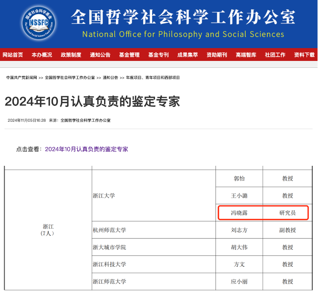 近日,全国哲学社会科学工作办公室网站公布了“2024年10月认真负责的鉴定专家”名单,我院体育学系“百人计划”研究员冯晓露入选。本次浙江省共有7位专家入选,其中浙江大学有3位专家入选。