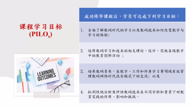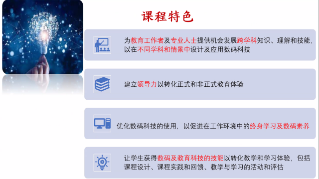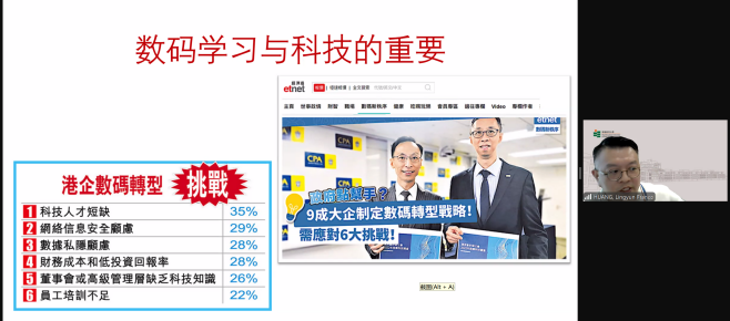首先,Dr.Huang全面地介绍了香港教育大学数码学习与科技文学硕士项目。从现实角度出发,谈论当下香港企业的数码转型进程、全球区域联盟对数码素养的重视、教师及学生对数码学习与科技的态度等,以此来论证数码学习与科技在现代社会的重要性。而后,Dr.Huang系统地介绍了该项目的课程特色、课程学习目标、课程结构、专修范畴、修读对象与职业前景,强调其注重培养教育工作者及专业人士在不同学科和情景中设计及应用数码科技,并形成良好的领导力与终身素养。