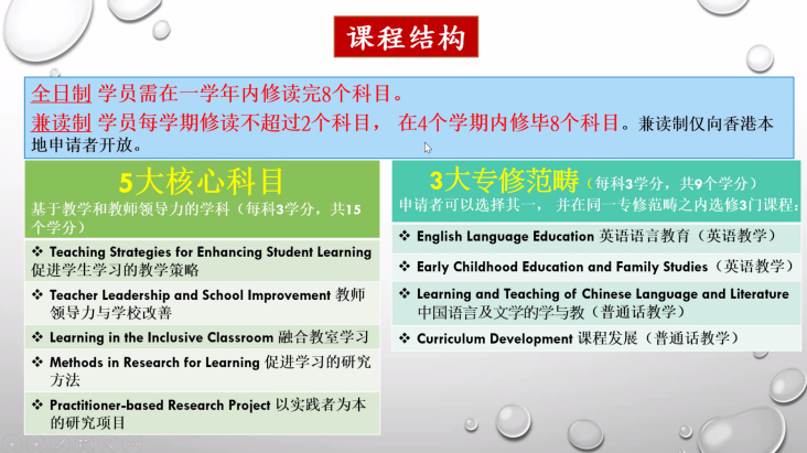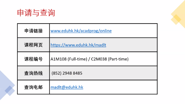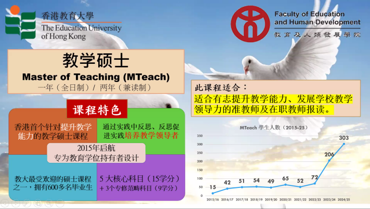 随后,Dr. Zhang为大家介绍了教学硕士这一项目。该项目适合有志提升教学能力、发展学校教学领导力的准教师及在职教师报读,且在培养过程中非常注重学生的多元学习——通过举办正念减压课程、情绪管理工作坊、专家讲座等拓展活动以促进全人发展。最后,Dr. Zhang也展现了自己对于教育事业的满腔热情,并鼓舞大家敢于尝试新事物、勇于冒险。