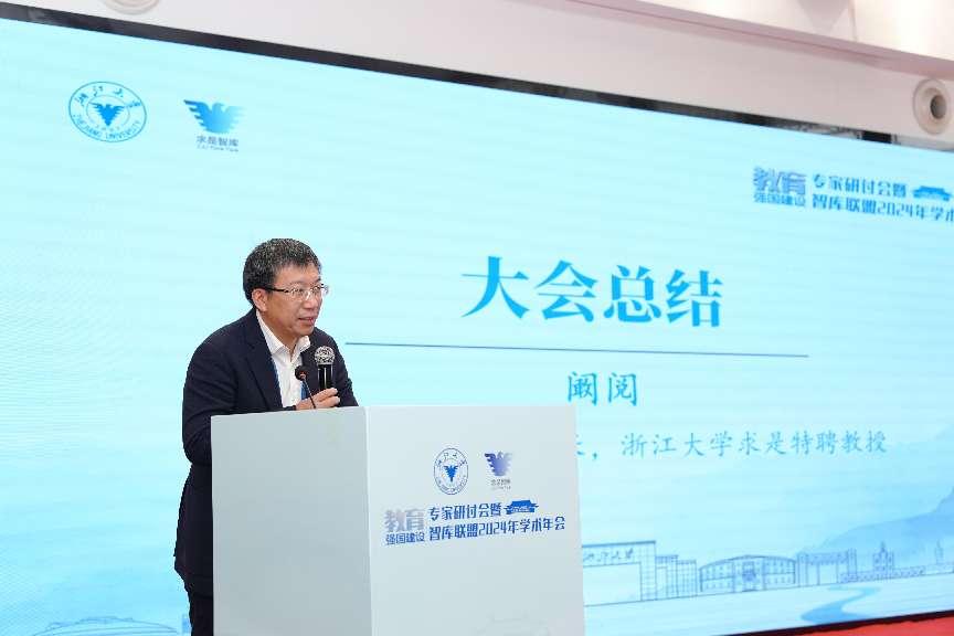 浙江大学教育学院院长、教育强国建设智库联盟理事长阚阅教授作大会总结。他对专家学者、联盟高校、所有与会者的支持表示感谢。他说,本次会议主题鲜明、观点新颖,来自不同领域的专家学者、媒体代表等围绕教育强国建设和智库建设,从不同角度提出了独到的见解,进行了思想的交流碰撞。在三个单元的环节中,3名学者作主旨报告,9名学者作专家报告,并进行了圆桌论坛分享和互动,达成了会议的预期目标。他表示,今后将吸收更多新成员加入智库联盟,不断丰富学术交流形式,以开设专题研讨会、笔谈专栏、编发专刊等方式开展更广泛的交流合作,起到联盟成员1+1>2的效果。他提出三点建议,一是联盟成员要发挥各自不同领域的专长和优势,加强交流协作、学科交叉、联合攻关,推动智库建设互补发展。二是发挥智库建设对学科的引领作用,聚焦教育强国建设面临的重大理论和现实问题,增强高校的科研和创新能力。三是履行智库人才培养使命,发挥智库育人功能,为智库人才建设提供源源不断的动力,赋能教育智库联盟发展壮大。