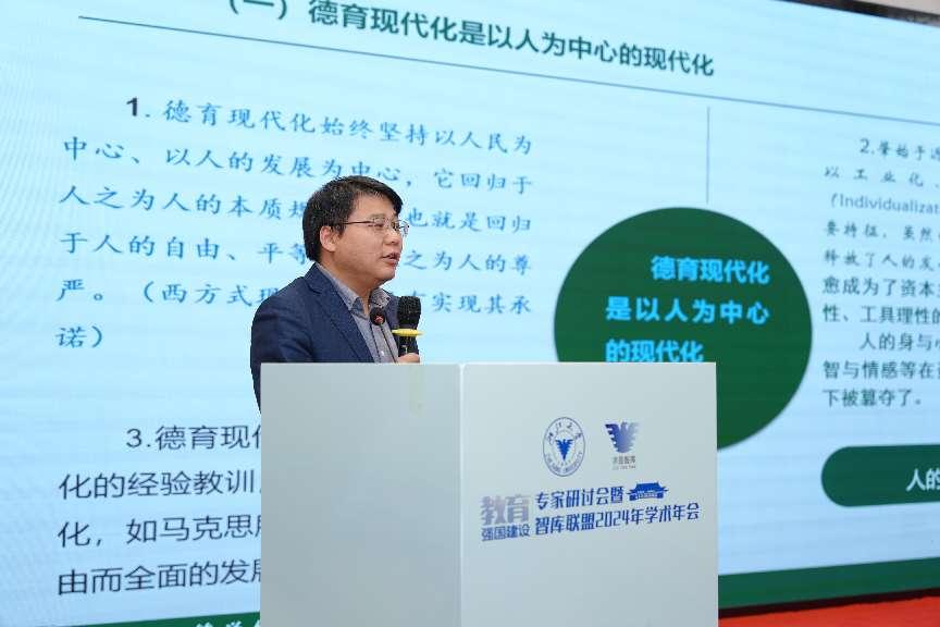 南京师范大学道德教育研究所叶飞教授以《德育现代化的中国意蕴与时代主题》为题,论述了教育强国背景下德育现代化的重要主题与路径探析。他表示,德育现代化是以人为中心的现代化、是德育整体体系的现代化、面向数智化转型的现代化。德育现代化需要围绕中国式现代化的核心主题,推进现代人的道德人格及精神观念的健全发展。因此,德育现代化应推进目的导向的转型,促进课程教学的现代化,实现共同价值的传递。提升治理能力,构建协同共治的德育治理体系。面向人的数智化生存,以技术革新促进德育体系的整体变革。