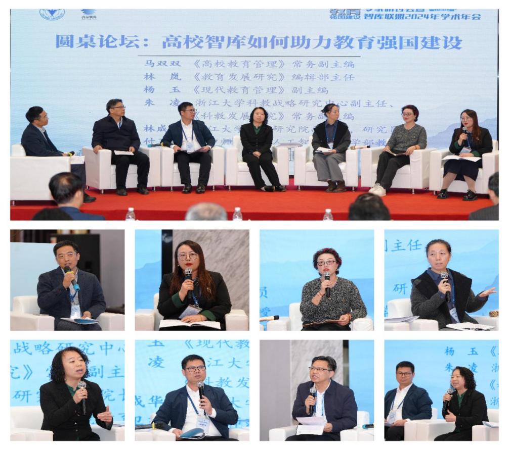 在以“高校智库如何助力教育强国建设”为议题的圆桌论坛中,《高校教育管理》杂志社常务副主编马双双认为我国高校教育智库研究应当开阔视野、提高格局,兼具本土情怀与国际视野,建立健全一个具有灵活性、前瞻性的评价体系,同时需要关注人工智能等新要素对于教育强国战略部署的重要意义。《教育发展研究》杂志编辑部主任林岚提出高水平期刊要关注高质量的政策研究,提升智库成果的学术转化力,通过促进理论研究与实证研究的交互建构,加强具有中国独特性的问题导向,同时注重方法的引领,突出创新思想性,建立教育研究、教育实践与教育决策的有效联系。在谈到如何完善数据平台与共享机制时,《现代教育管理》副主编杨玉指出,高校智库建设应打破数字壁垒,激励不同智库之间的学术合作与国际合作,形成建设教育强国的合力,并通过加强转化与传播提升智库成果的国际话语影响力与认可度。浙江大学科教发展战略研究中心副主任、《科教发展研究》常务副主编朱凌研究员指出,高校智库在助力教育强国过程中发挥了重要的组织力与号召力,建设性地形成了科教发展、科教融合、科教治理的话语体系,期刊应该继续完善选题机制、凝炼机制与转化机制,为教育强国战略提供更多支持。针对“高校智库何为”这一议题,浙江大学北京研究院副院长林成华研究员认为,高校智库要把学术资源转化为人才资源,使学生具备政策素养,推动建立人才汇聚机制、产品生成机制、人才培养机制,资源投入机制与评价激励机制。华中师范大学人工智能教育学部付卫东教授以华中师范大学高校智库建设的成果为例,介绍了高校智库如何开展政策咨询、社会调查等工作,使智库研究具有预见性、储备性和引领性,为政府决策和社会发展提供科学依据和决策支持。