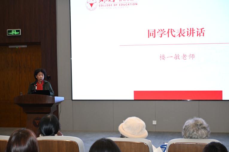 体育学系六五届田径专科班班长兼团支书楼一敏老师代表全体校友发言。她回顾了当年同窗共度的青春岁月,表达了对母校栽培和恩师教诲的感激之情。楼一敏老师表示,此次重返母校既是一次温暖的团聚,也是对浙大精神的再一次传承。她希望同学们珍惜这份深厚的同学情谊,继续关注和支持母校发展,共同为学院的未来贡献力量。