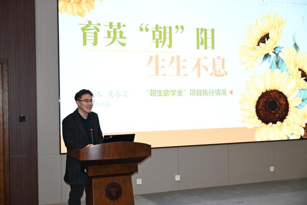 在仪式伊始,教育学院团委副书记吴春霆全面回顾了“朝生助学金”项目的执行情况。项目启动以来,已有83名本科生从中受益,支持着一批又一批教院学子努力拼搏,追逐梦想。“朝生助学金不仅缓解了我们的经济压力,更给予我们精神上的支持和鼓励,让我们更有信心面对挑战。”在仪式上,受助学生代表向叶朝生先生表达了浓浓的感激之情。