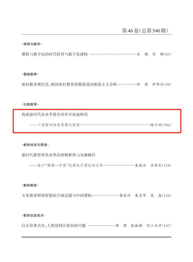 我院教育学系徐小洲教授的学术论文《构建新时代高水平教育对外开放新格局——三型联动教育对外开放模式探索》在2025年第1期《教育研究》上刊发。