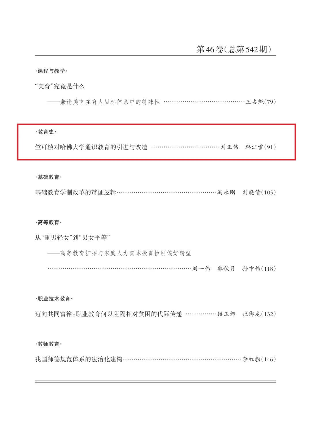 我院课程与学习科学系刘正伟教授与课程与教学论博士研究生韩江雪的学术论文《竺可桢对哈佛大学通识教育的引进与改造》在2025年第3期《教育研究》上刊发。