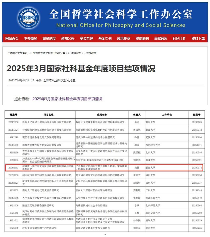 浙江大学教育学院张佳教授主持的国家社会科学基金社会学青年项目《城乡中小学校长交流轮岗绩效的影响因素与实现机制研究》(课题批准号:20CSH033)结题鉴定为优秀。博士生周梦如、刘智慧等作为主要成员参与了该项目研究。