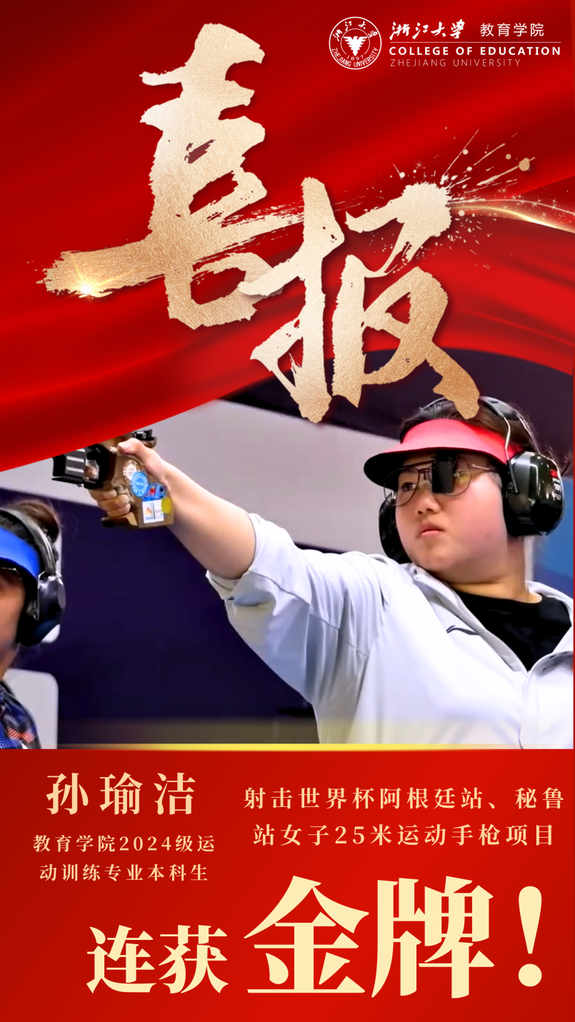 孙瑜洁从小就展现出了较高的射击天赋。小学四年级时,孙瑜洁加入富春三小射击社团,五年级加入杭州女子射击队。2024年孙瑜洁进入到浙江大学教育学院运动训练专业学习。今年是孙瑜洁首次参加世界杯,初次站上世界杯舞台便连续两站斩获冠军,充分展现了教院健儿的青春与风采!