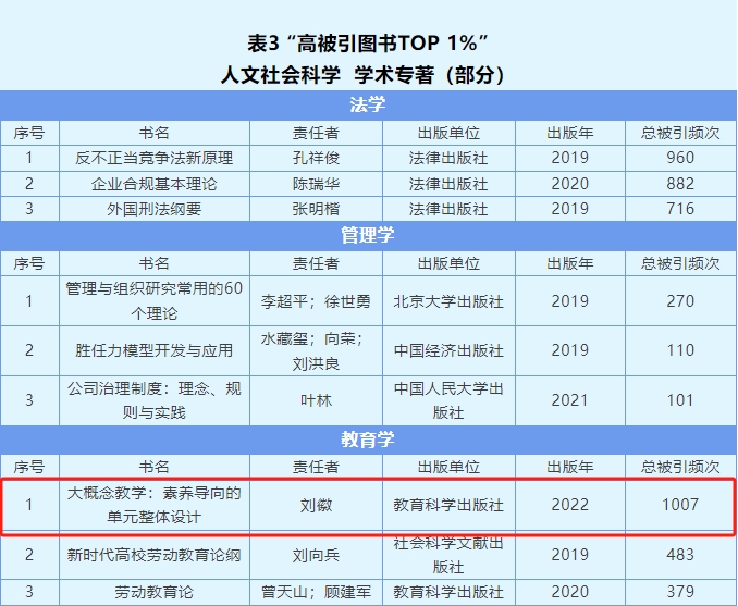 2025年4月22日,中国知网·中国科学文献计量评价研究中心发布“高被引图书TOP 1%(2019-2023)”榜单,我院刘徽教授的学术专著《大概念教学:素养导向的单元整体设计》入选,其总被引频次位列教育学专著首位,同时在人文社会科学领域也位居第一。