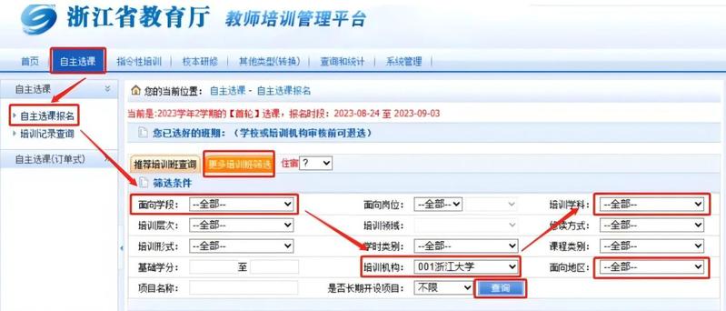 步骤2: 点击【教师培训管理平台】-【自主选课】-【自主选课报名】-【更多培训班筛选】-面向学段选择【全部】-培训机构选择:【浙江大学001】;点击【查询】,选择对应项目进行申报。