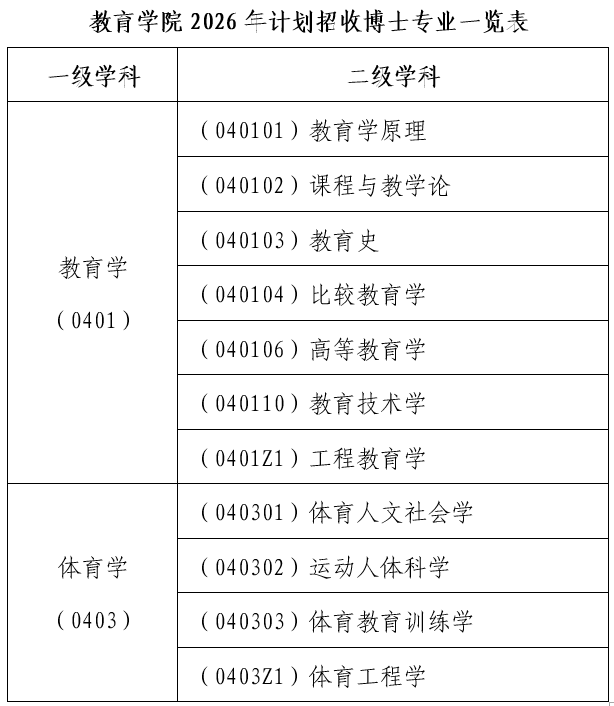 2026年教育学院计划在教育学和体育学两个一级学科下设的二级学科招收全日制学术学位博士生。