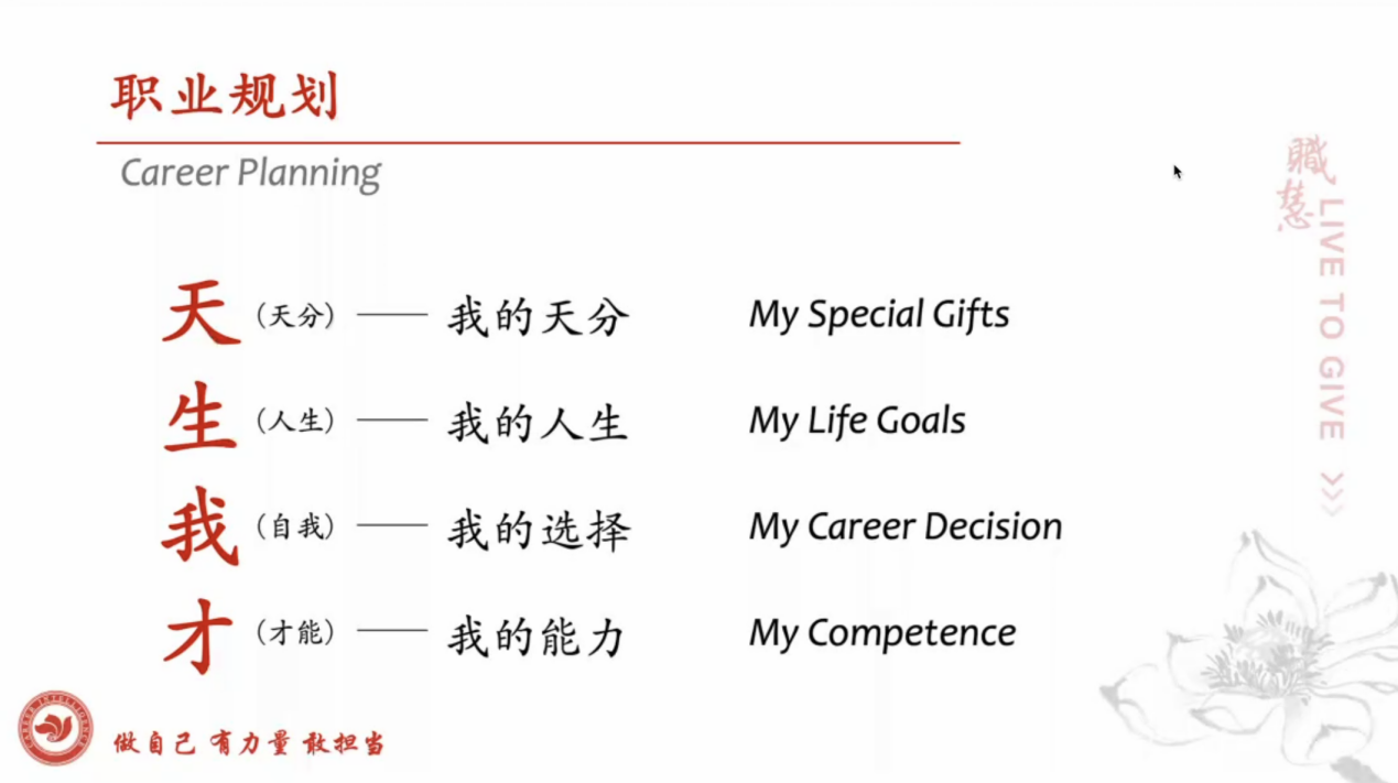 “生”指的是人生目标。薛老师分享了自己20年前确立的人生目标:成为终身成长并对社会有价值的人。她用HR职业生涯的进阶印证了第一个标准——做有意义的工作。第二个标准是"livetogive"的利他精神,这在她十余年的公益服务经历中深刻体现。在讲解之外,她也鼓励大家设定个人目标并分享到聊天群,增进了师生互动和同学之间的相互启发。