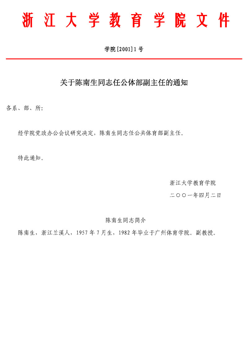 学院[2001]1号 关于陈南生同志任公体部副主任的通知及陈南生同志简介