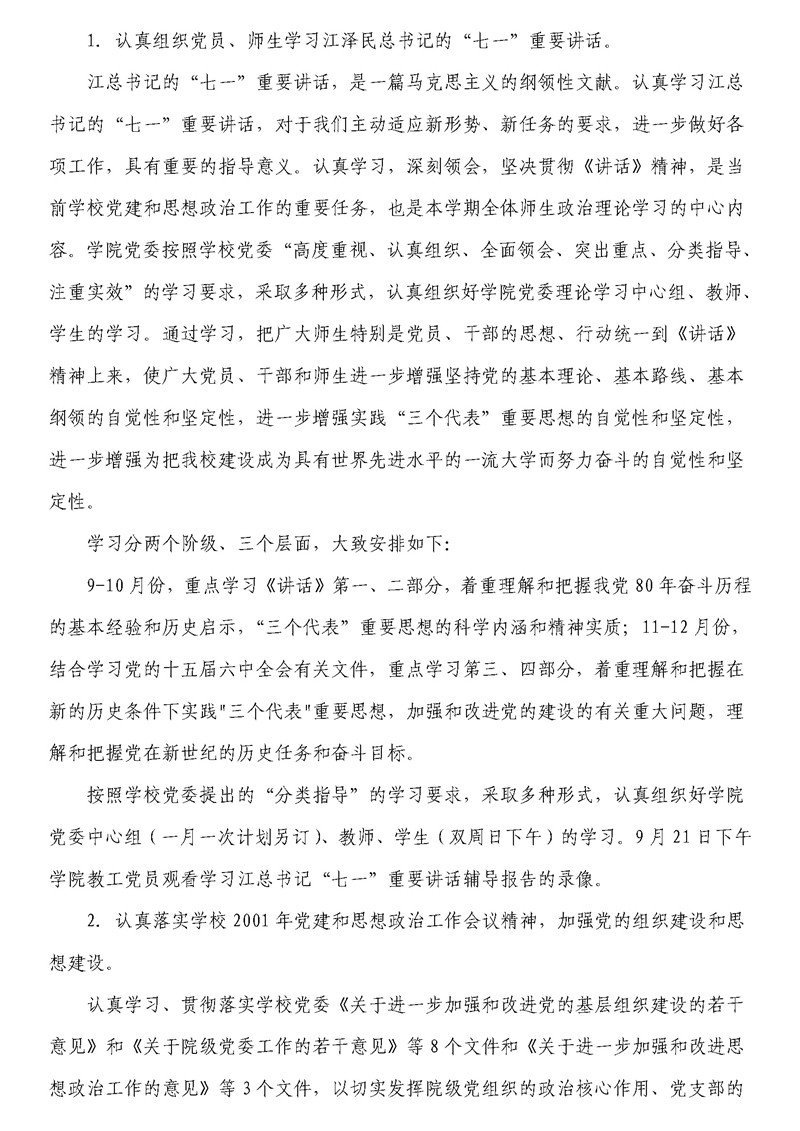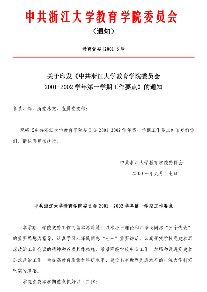 教育党委[2001]6号 关于印发《中共浙江大学教育学院委员会2001-2002学年第一学期工作要点》的通知