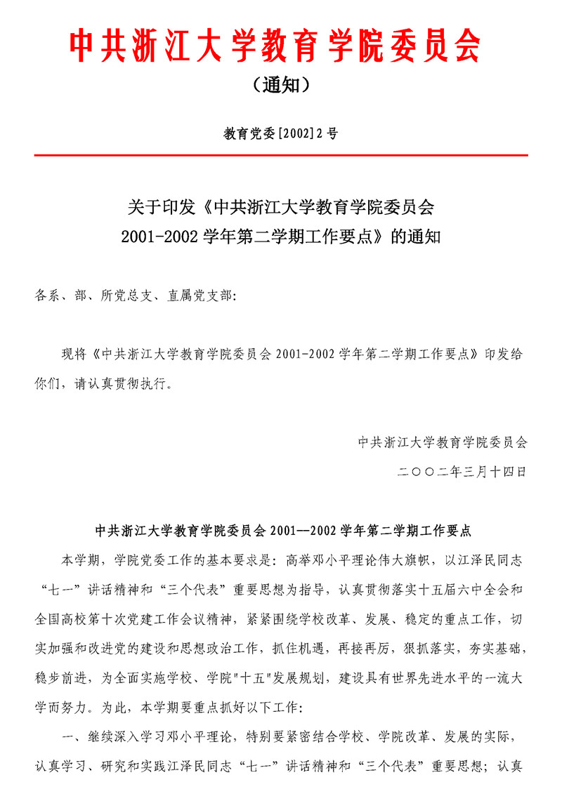 教育党委[2002]2号 关于印发《中共浙江大学教育学院委员会2001-2002学年第二学期工作要点》的通知