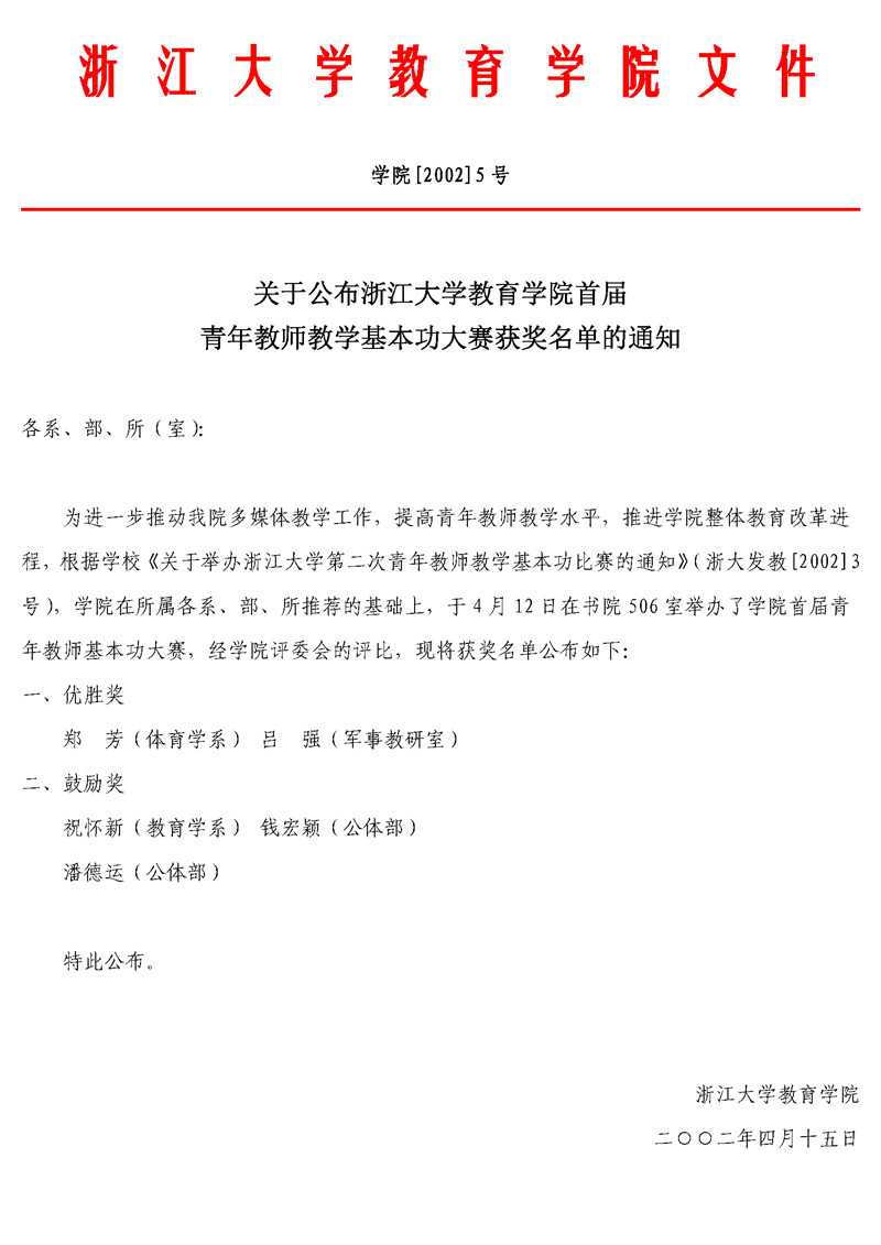 学院[2002]5号 关于公布学院首届青年教师教学基本功大赛获奖名单的通知