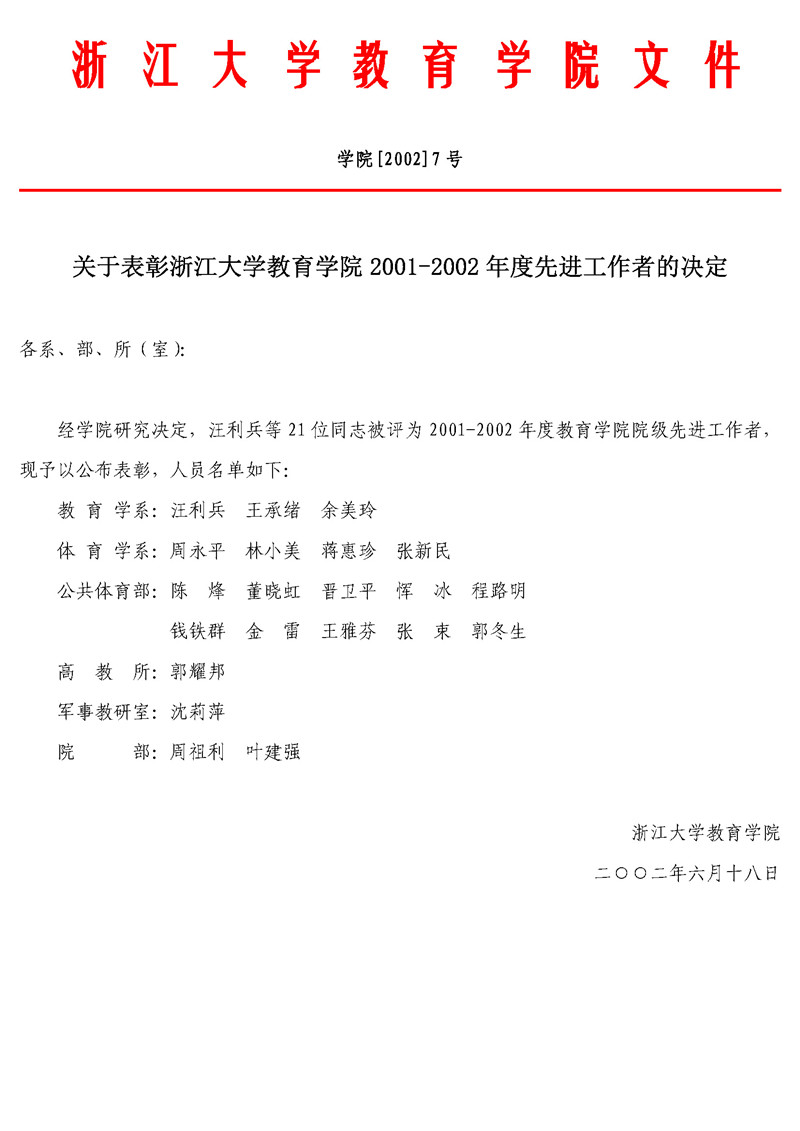 学院[2002]7号 关于表彰浙江大学教育学院2001-2002年度先进工作者的...