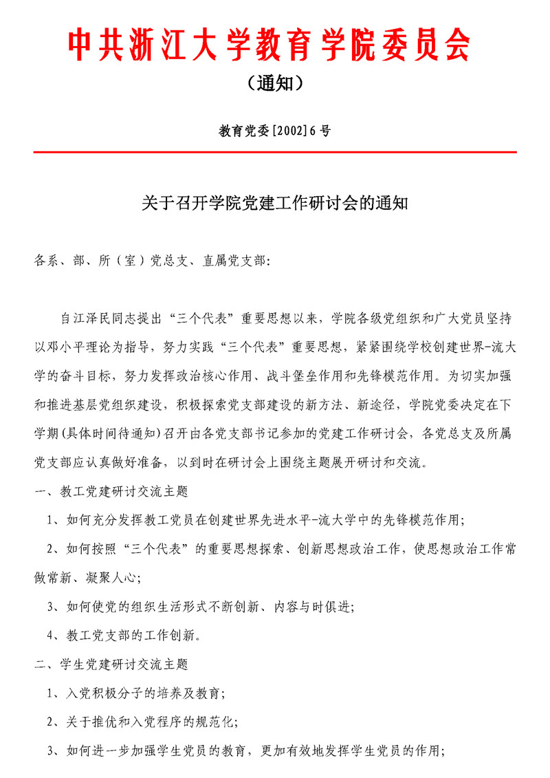教育党委[2002]6号 关于召开学院党建工作研讨会的通知