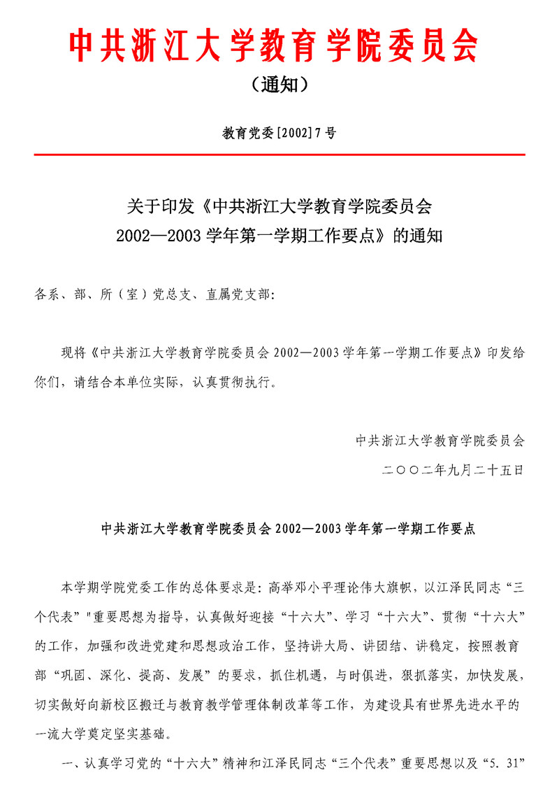 教育党委[2002]7号 关于印发《中共浙江大学教育学院委员会2002-2003学年第一学期工作要点》的通知