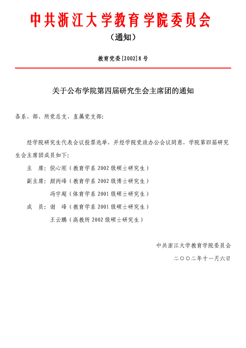 教育党委[2002]8号 关于公布学院第四届研究生会主席团的通知