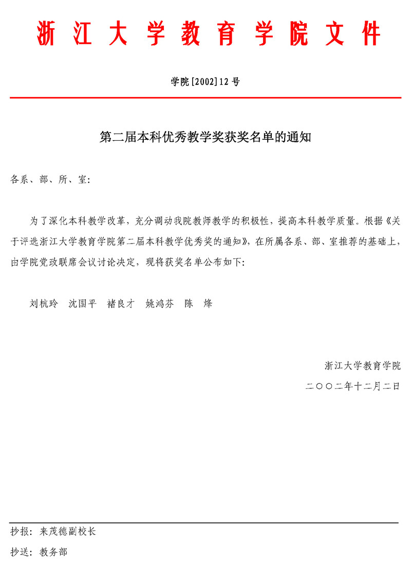 学院[2002]12号 关于公布浙江大学教育学院第二届本科优秀教学奖获奖名单的...