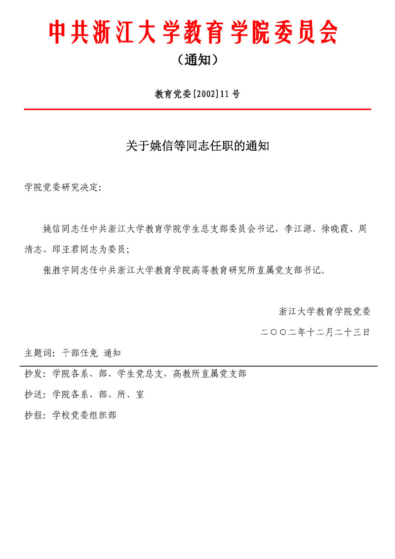 教育党委[2002]11号 关于姚信等同志任职的通知