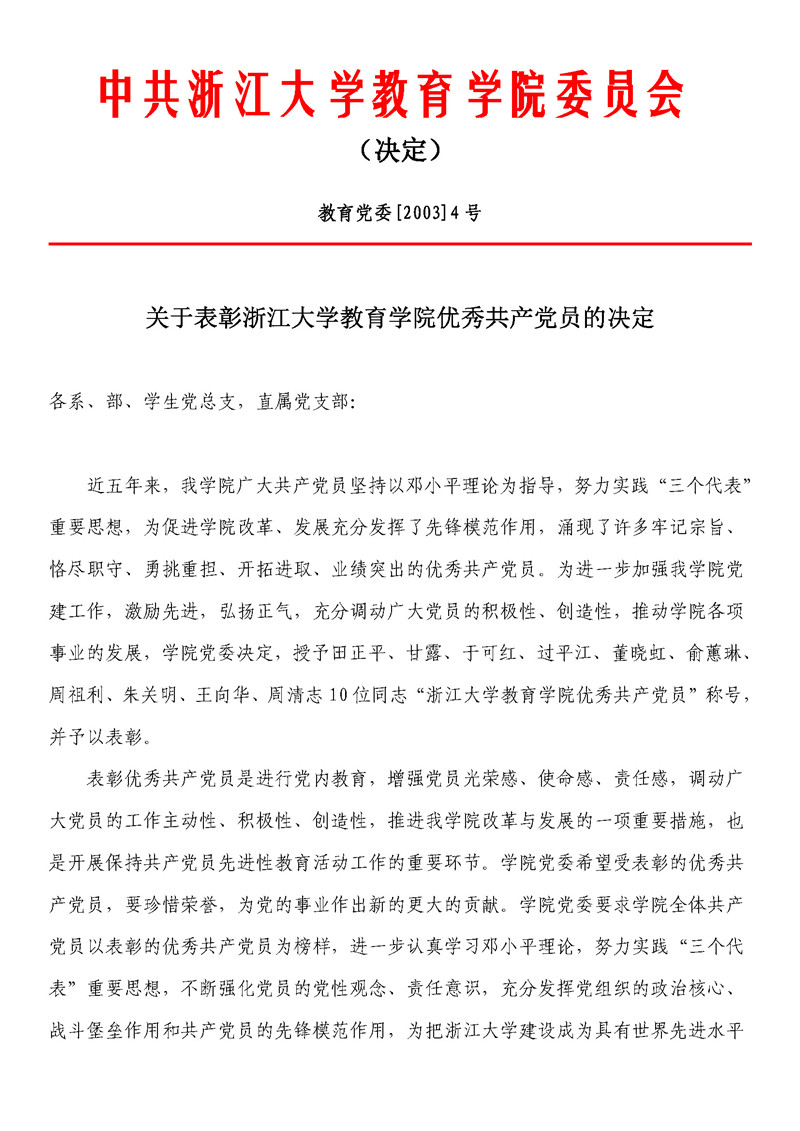 教育党委[2003]4号 关于表彰浙江大学教育学院优秀共产党员的决定