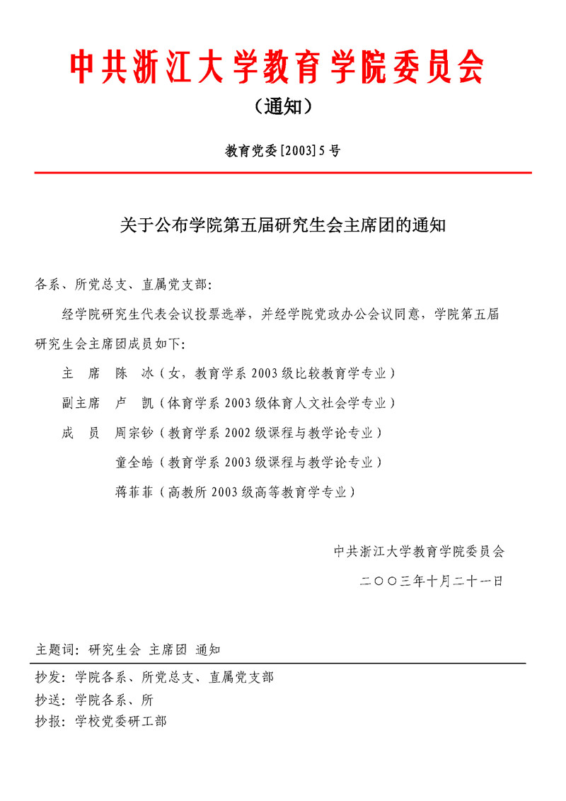 教育党委[2003]5号 关于公布学院第五届研究生会主席团的通知